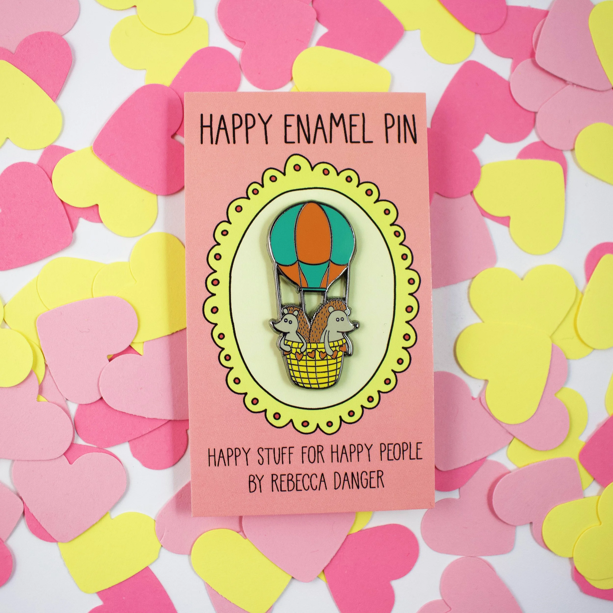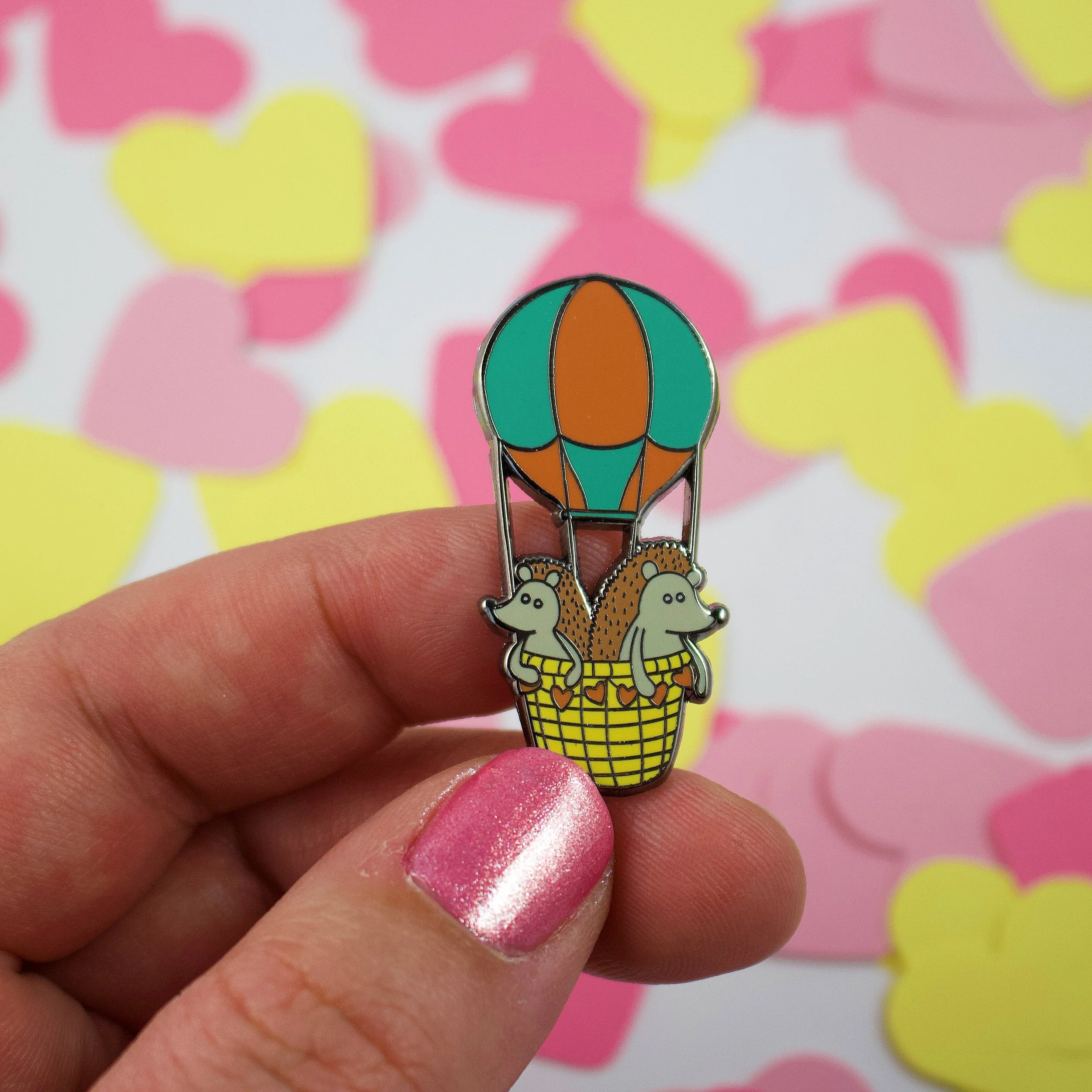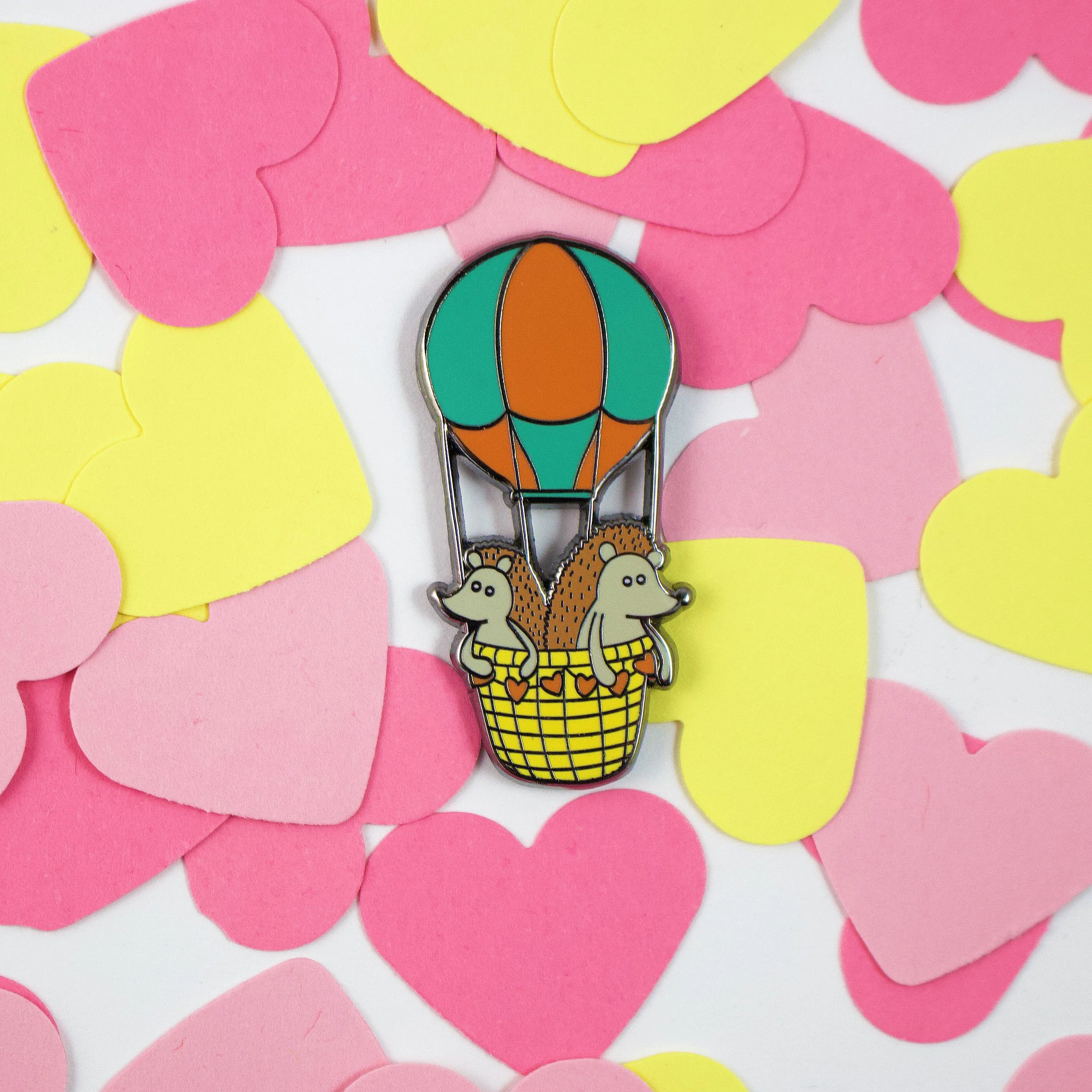 Ridiculously cute pair of hedgies in a hot air balloon enamel pin! Just the thing you need to spark joy and add a little more happy to your day. An enamel pin made from my hot air balloon hedgies illustration.