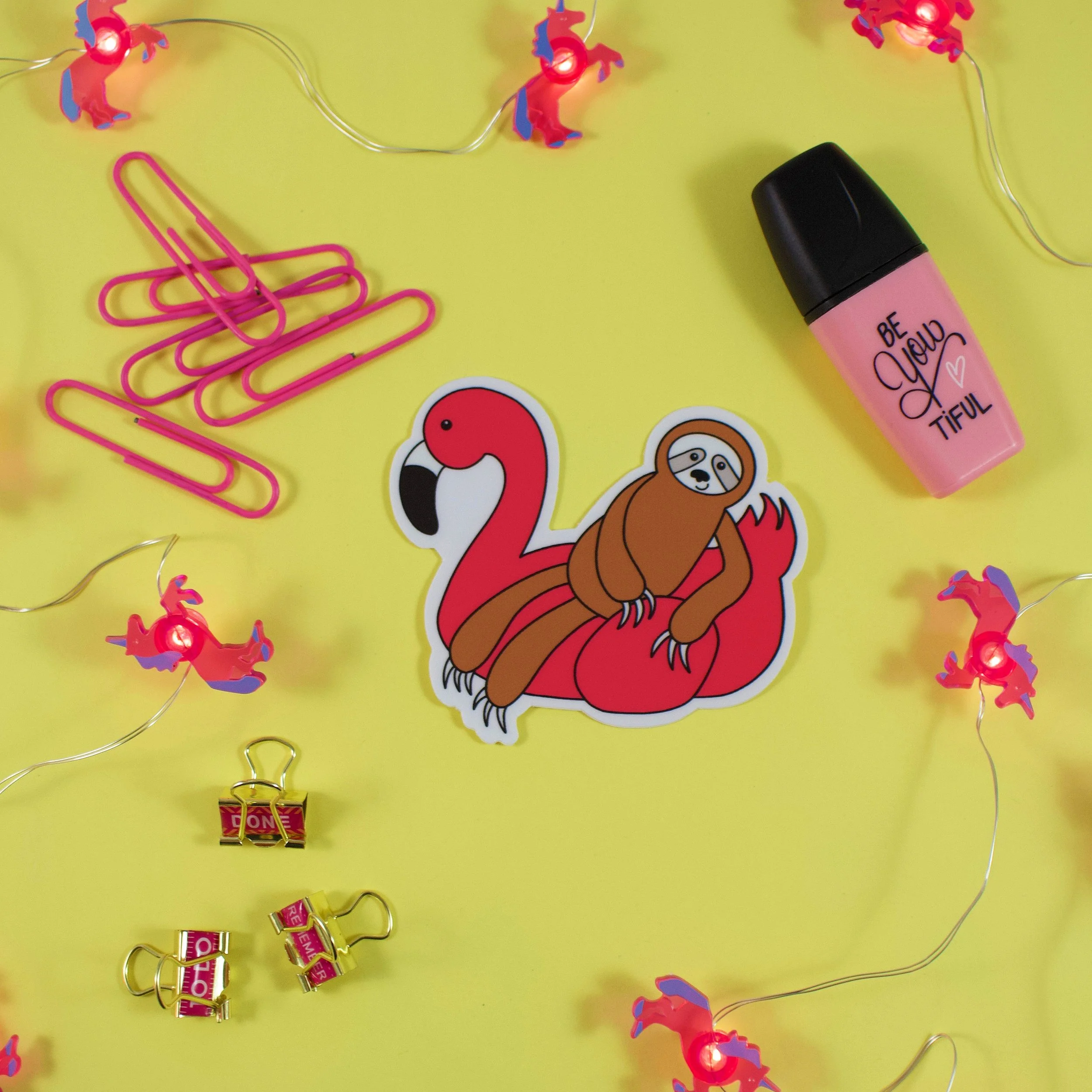 Ridiculously cute summery relaxing sloth on an adorable flamingo floaty sticker! Just the thing you need to add more happy to your day.